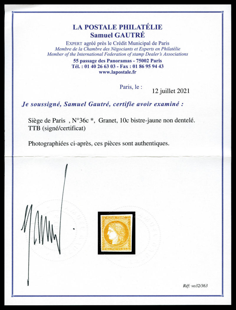 452 imageN°36c, Granet, 10c bistre-jaune non dentelé. TTB (signé/certificat) Qualité: * Cote: 450 euros (Image) (image2) (All Images)