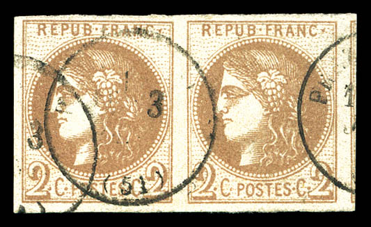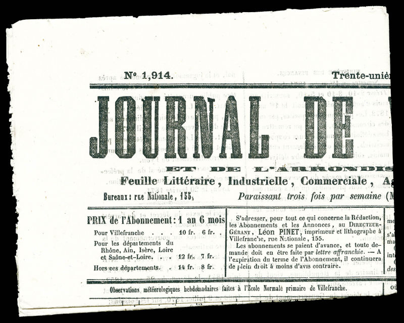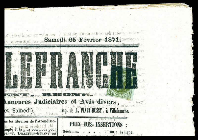 Bordeaux report 2 obl typographique sur le 'Journal de Villefranche' complet du 25 fevrier 1871. SUPERBE. R.R. (certificat) Qualité: Oblitéré Cote: 4800 euros