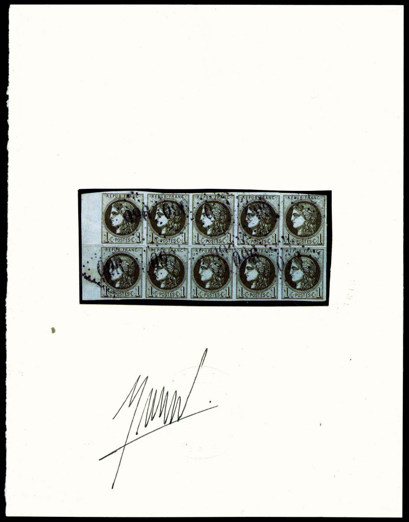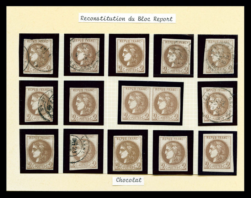 1, Exceptionnelle reconstitution du bloc report de 15 exemplaires composé de 8 valeurs neuves et 7 oblitérées (2 pd) dont nuances. SUPERBE. R.R.R. (certificat) Qualité: Oblitéré Cote: 30000 euros (Image) (image2)