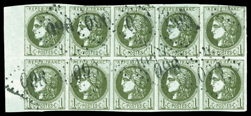 foncé type II Report 2, bande de 10 exemplaires bord de feuille latéral obl GC 860, légère froissure hors timbres. SUPERBE. R.R. (signé Calves/certificat) Qualité: Oblitéré