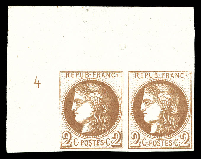 Chocolat Report 1 en paire coin de feuille intégral avec petit chiffre '4' en marge. PIECE RARISSIME. SUPERBE (signé Calves/certificat) Qualité: (*) (Image)