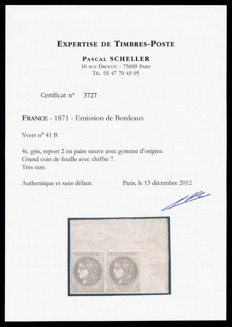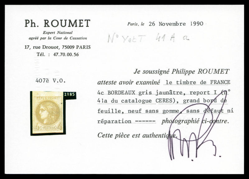 gris-jaunâtre report 1, grand bord de feuille. TTB (signé Calves/Brun/certificats) Qualité: (*) Cote: 2600 euros (Image) (image2)