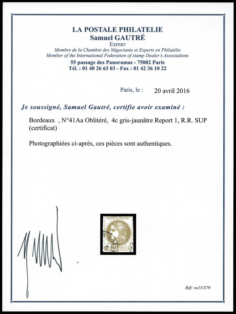 gris-jaunâtre Report 1, R.R. TB (certificat) Qualité: Oblitéré Cote: 4700 euros (Image) (image2)