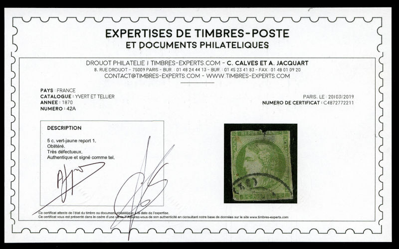 vert-jaune Report 1 obl càd, défectueux. R.R (certificats) Qualité: Oblitéré Cote: 7800 euros (Image)
