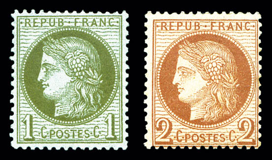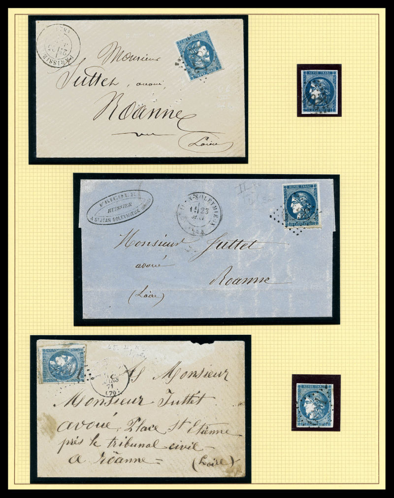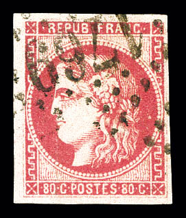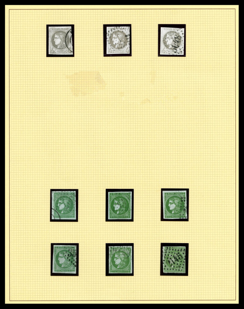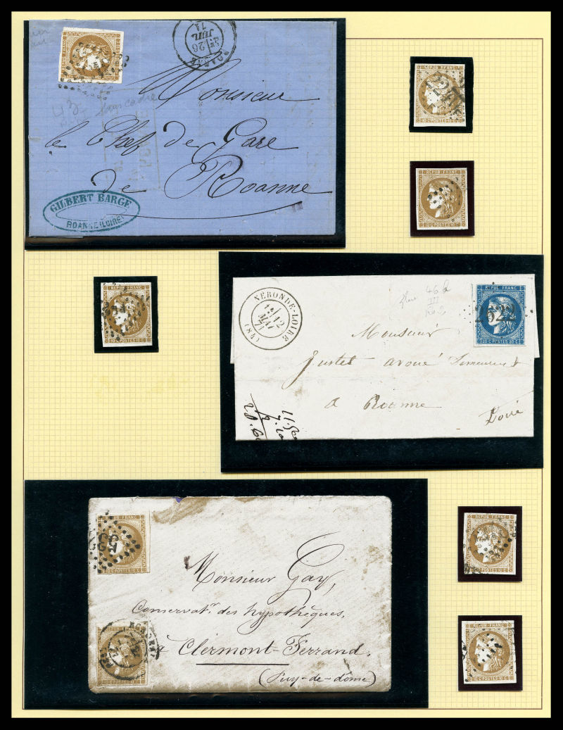 Ensemble de 67 timbres comprenant 1c (4 ex), 2c (6 ex avec obliterations et nuances dont chocolat), 4c (3 ex), 5c (6 ex), 10c (15ex dont 4 lettres), 20c (19 ex dont 6 lettres), 30c (2 ex), 40c (7 ex dont une lettre) et 80c (5 ex dont paire sur lettre