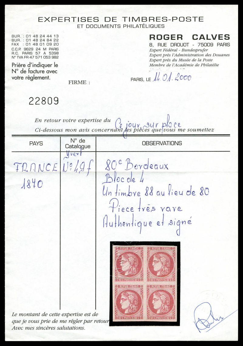lieu de 80 tenant à normaux dans un bloc de quatre, fraîcheur postale, GRANDE RARETE DE LA PHILATELIE FRANCAISE. SUPERBE (signé Calves/certificats) Qualité: *