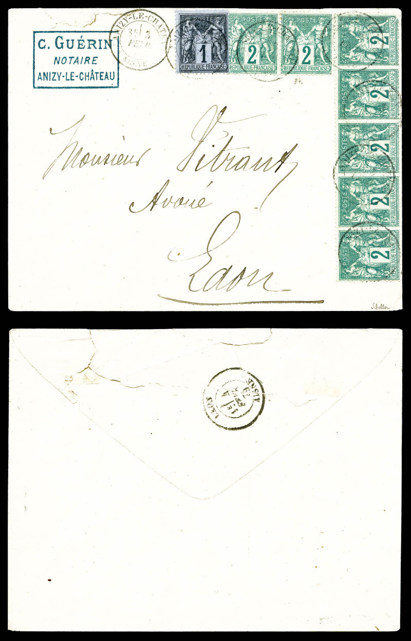 type I (bande de 5 + paire) et N°83 sur lettre au départ de Anizy le Chateau le 3 fevrier 1879 pour Laon. Affranchissement exceptionnel. B/TTB. R.R (signé Scheller/certificat) Qualité: Oblitéré (Image)