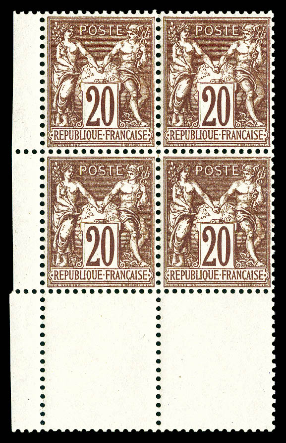 brun-lilas foncé type I, bloc de quatre coin de feuille, fraîcheur postale, très bon centrage. SUPERBE. R.R.R (certificat) Qualité: ** (Image) (image2)