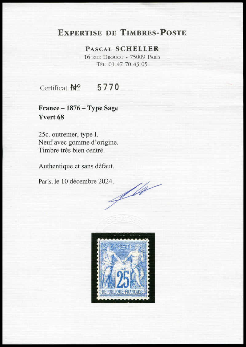 outremer type I, défaut d'angle mais très belle présentation. (signé Thiaude/certificat) Qualité: * Cote: 11500 euros (Image)