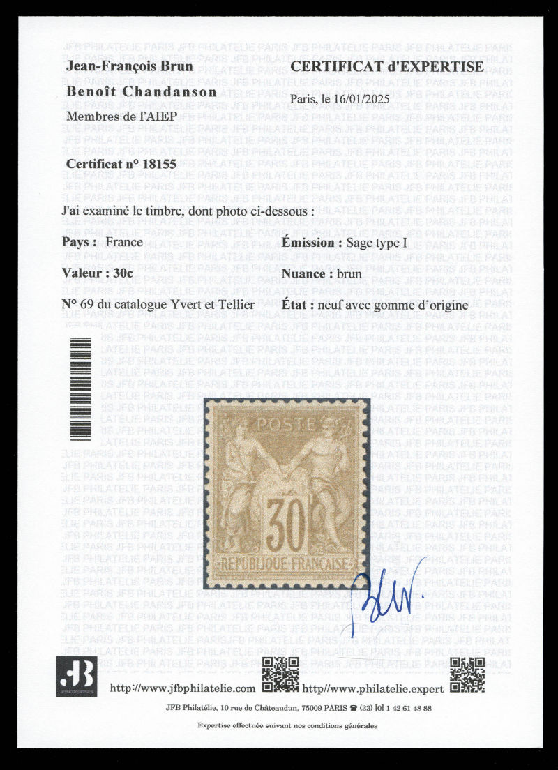 type I. TB (certificat) Qualité: * Cote: 1400 euros (Image)