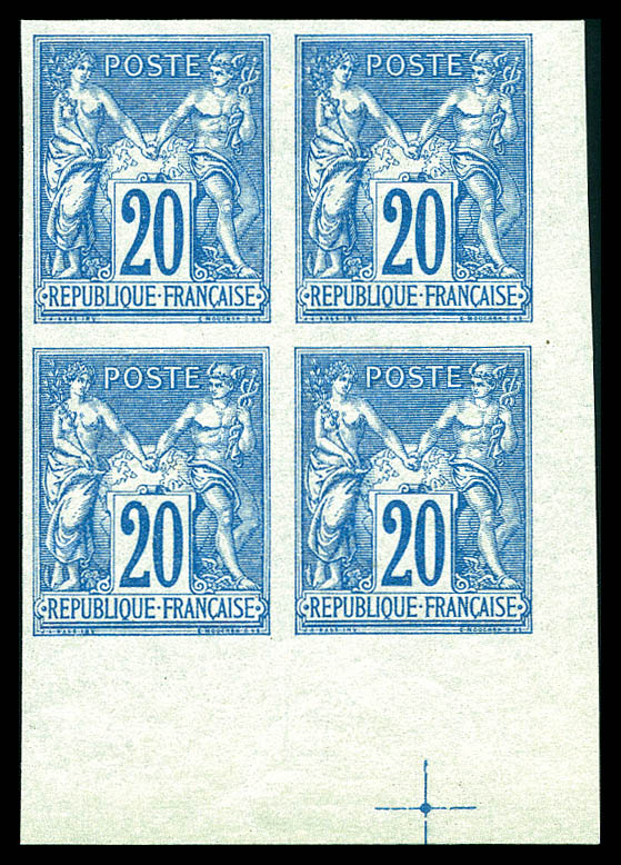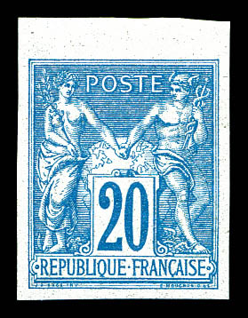 20c bleu type I. la totalité du tirage, imprimé en décembre 1876, fut détruite par l'Administration le 24 février 1880. Quelques exemplaires subsistent. Superbe exemplaire du timbre le plus rare de France. R.R.R. (signé Calves/certificats