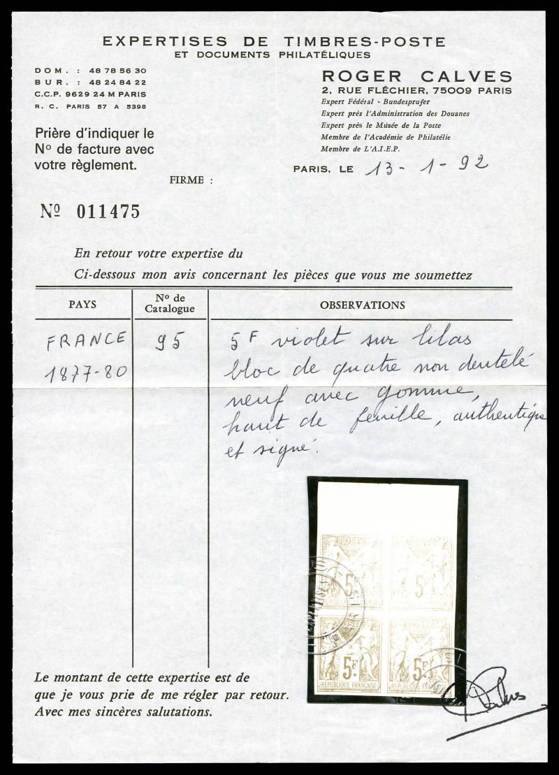 sur lilas non dentelé en bloc de quatre haut de feuille latéral (2ex*), fraîcheur postale. TTB (signé Calves/certificats) Qualité: ** (Image) (image2)