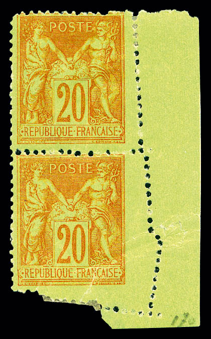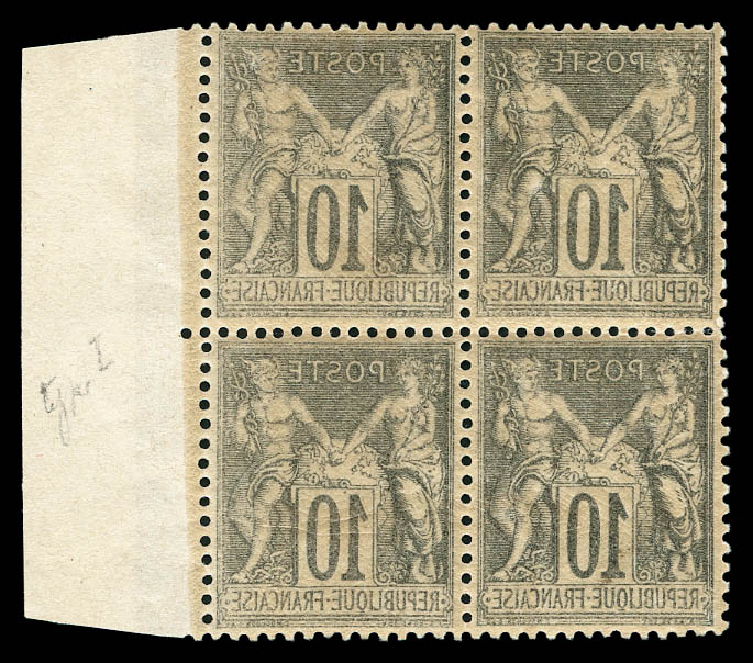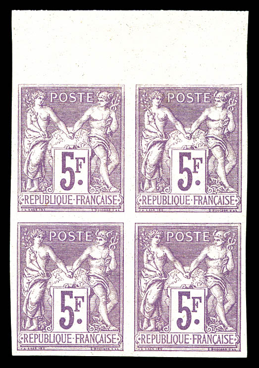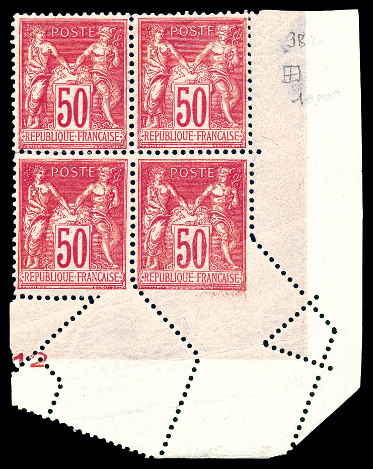 en bloc de quatre coin de feuille avec piquage oblique par pliage (1ex normal *), signatures Sage et Mouchon effacées. SUP. R. (certificat) Qualité: ** (Image)