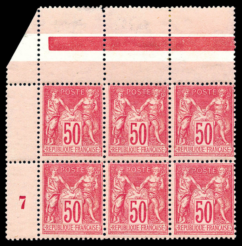 sur rose, spectaculaire variété de piquage sur bloc de 6 (piquage oblique et décalé) cdf. SUPERBE. R. (signé Calves/certificat) Qualité: ** (Image)