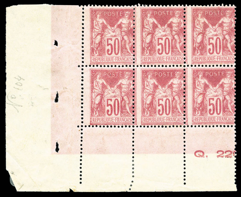 865 imageN°104, 50c rose type III: PIQUAGE A CHEVAL sur bloc de six coin de feuille (2ex*), fraîcheur postale, SUP (certificat) Qualité: ** (Image)