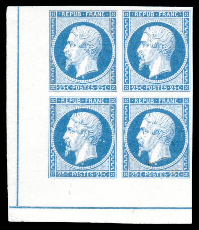 879 imageN°10, Essai: 25c bleu papier pelure en bloc de quatre bord de feuille avec filet d'encadrement, SUPERBE (certificat) Qualité: (*) Cote: 1600 euros (Image)