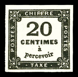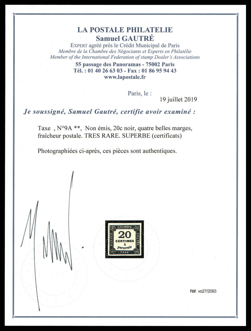 20c noir, quatre belles marges, une des 2 pièces sans charnière vue à ce jour, fraîcheur postale. TRES RARE. SUPERBE (certificats) Qualité: ** (Image) (image2)