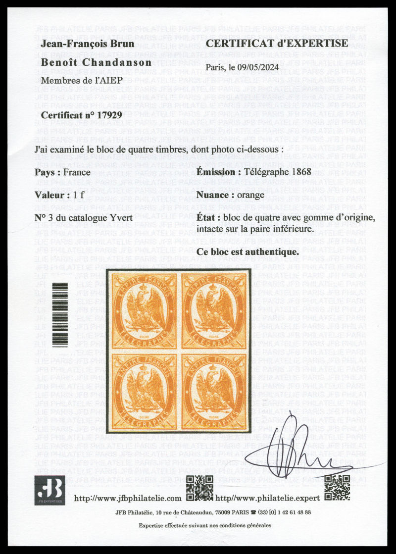 947 imageN°3, 1f orange en bloc de quatre (2ex*), fraîcheur postale. SUPERBE. R. (certificats) Qualité: ** (Image) (image2) (image3) (All Images)