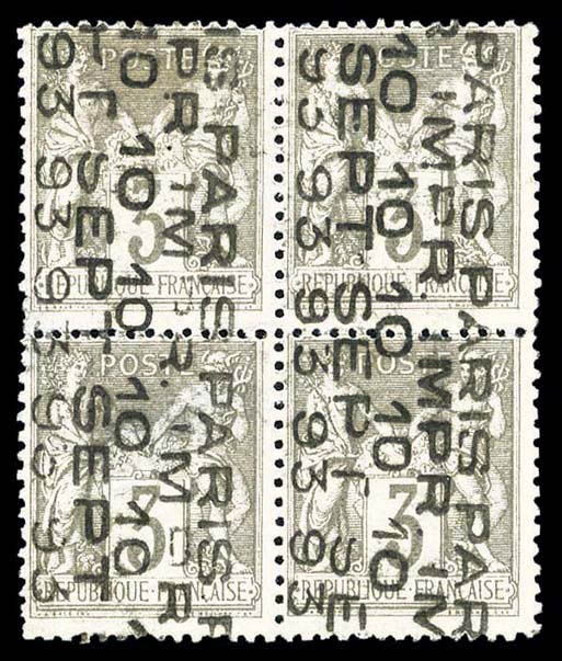 957 imageN°13, 3c gris surchargé 5 lignes en bloc de quatre, pelurage sur 2 exemplaires, RARE ET SUPERBE (signé Brun/certificat) Qualité: (*) Cote: 6800 euros (Image)