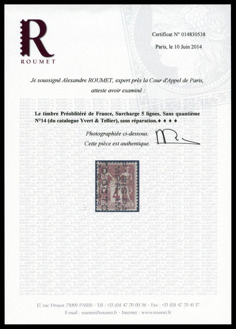 959 imageN°14a, 4c lilas-brun surchargé 5 lignes SANS QUANTIEME, TTB (signé/certificats) Qualité: (*) Cote: 800 euros (Image) (image2) (All Images)