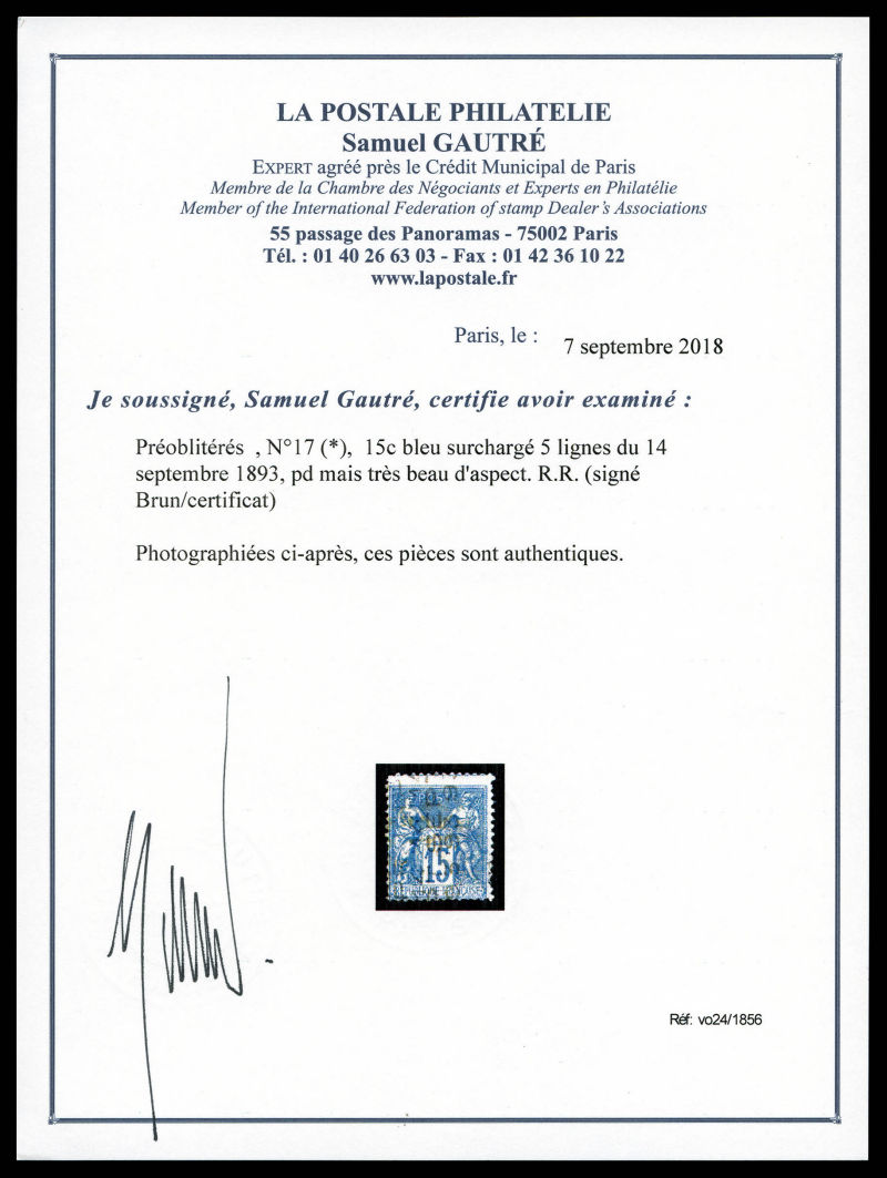 965 imageN°17, 15c bleu surchargé 5 lignes du 26 septembre 1893, SUP. R.R. (certificat) Qualité: (*) (Image)