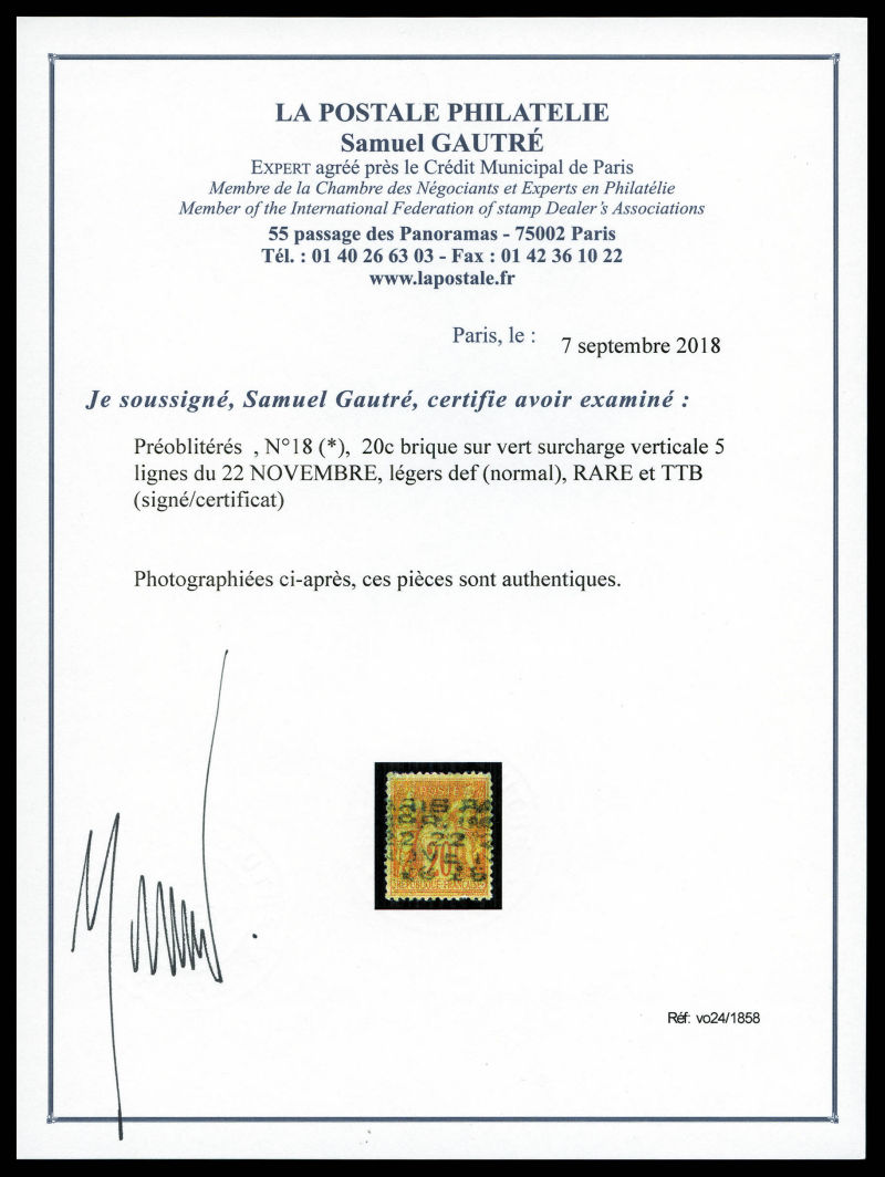 967 imageN°18, 20c brique sur vert surcharge verticale 5 lignes du 22 NOVEMBRE, légers def (normal), RARE et TTB (signé Scheller/certificat) Qualité: (*) Cote: 1500 euros (Image) (image2) (image3) (All Images)