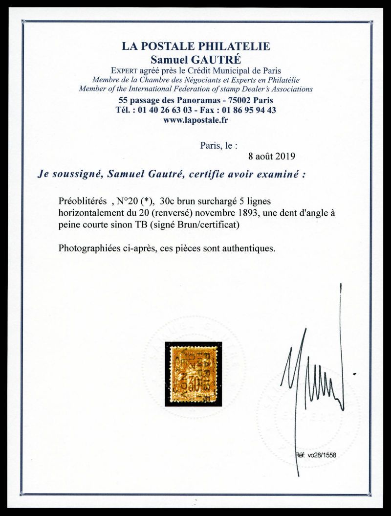 968 imageN°20, 30c brun surchargé 5 lignes verticalement du 20 (renversé) novembre 1893, une dent d'angle à peine courte sinon TB (signé Brun/certificat) Qualité: (*) (Image) (image2) (All Images)