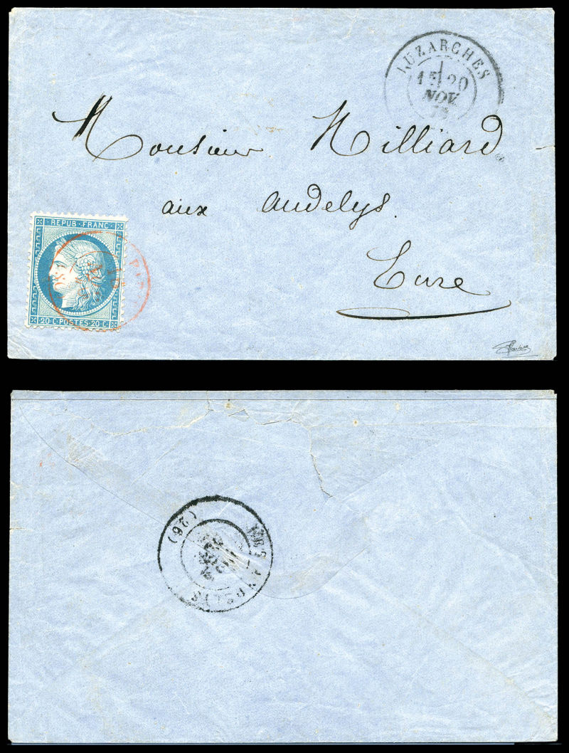 UHRICH, 20c Siège obl càd Paris 'SC' rouge du 16 nov 1870 sur lettre à destination des Andelys, cachet de passage à Luzarches le 20 nov 70. Arrivée le 24 noc 70. TTB (certificat) Qualité: Oblitéré (Image)