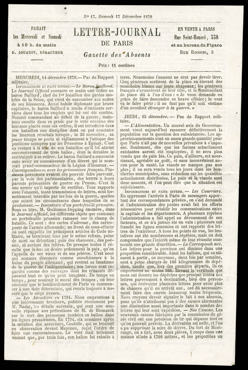 RENAULT', Gazette des Absents N°15', 20c Siège obl étoile +Càd du 10 dec 1870, arrivée à Sablé (Sarthe) le 18 dec 1870, SUP (certificat) Qualité: Oblitéré (Image) (image2)