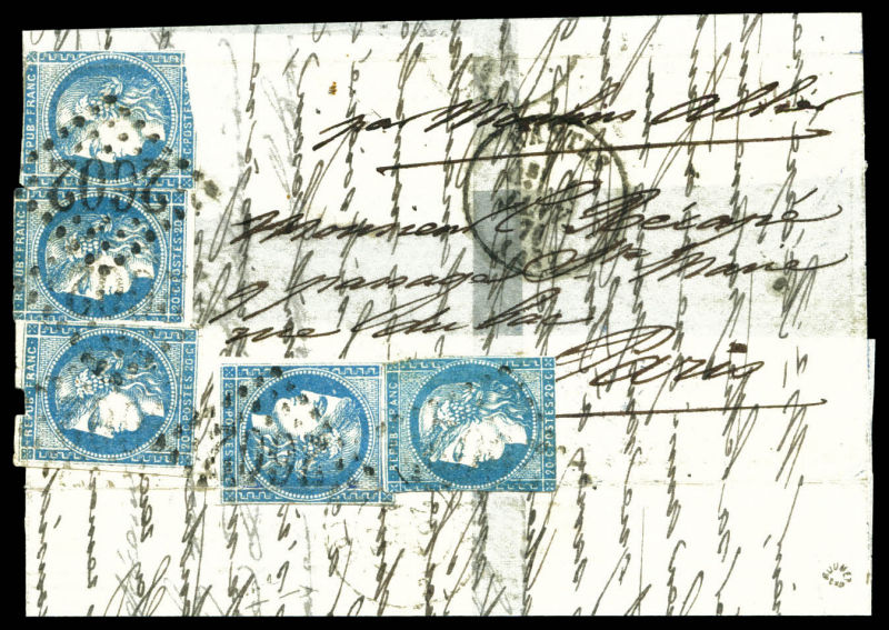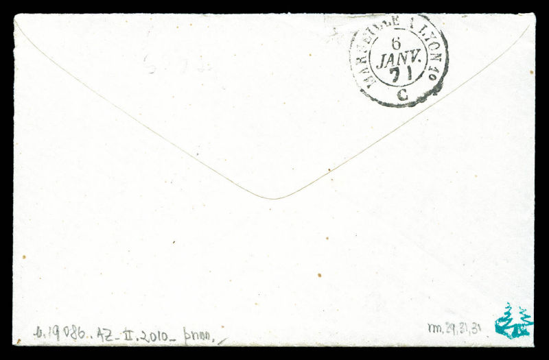 1004 imageRepêchage du 29 novembre 1872: Boule de Moulins de ROQUEMAURE (Gard) le 5 janvier 1871 pour Paris avec 20c + 80c Lauré, càd de Marseille à Lyon au verso et rarissime cachet de repêchage de PARIS le 29.11.72. SUPERBE. R.R.R. (certificats) Qualité: Oblitéré Cote: 15000 euros (Image) (image2) (image3) (All Images)