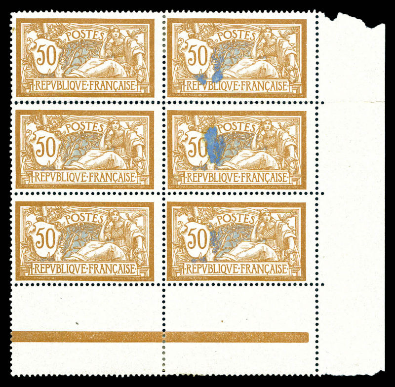 Merson: 3 exemplaires avec tâches d'impression de l'encre de la teinte de fond bleutée tenant à normaux en bloc de 6 coin de feuille (2ex*). PIECE SUPERBE. R.R.R. (signé Brun/certificat) Qualité: ** (Image)