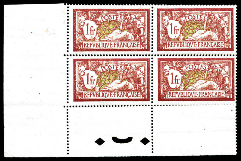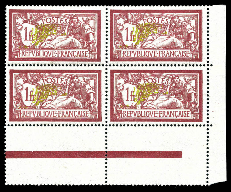 Merson, 1F lie de vin et olive en bloc de quatre cdf, TB (certificat) Qualité: ** Cote: 460 euros (Image)