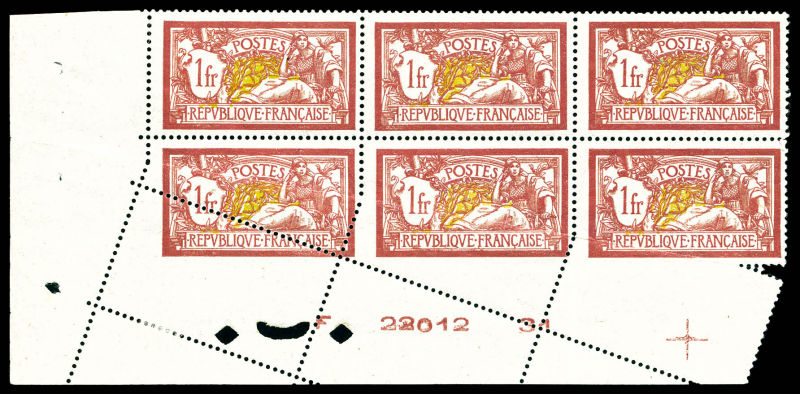Merson: 3 exemplaires piquage oblique par pliage tenant à normaux * en bloc de 6 coin de feuille numéroté avec croix de repère, PIECE SUPERBE. R.R.R (certificat) Qualité: **