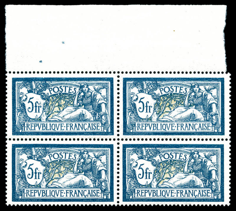 Merson: bleu et olive en bloc de quatre bdf, très bon centrage. SUP (certificat) Qualité: ** Cote: 3400 euros (Image)
