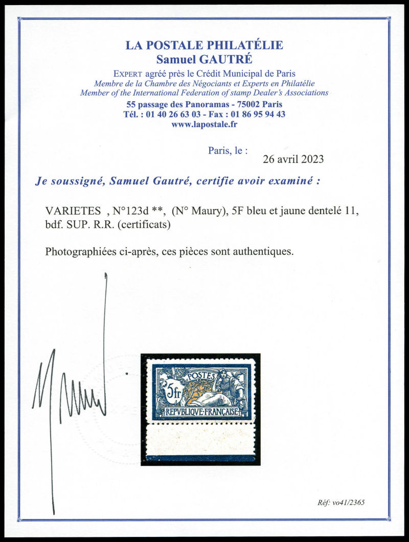 Maury), 5F bleu et jaune dentelé 11, bdf. SUP. R.R. (certificats) Qualité: ** Cote: 2400 euros (Image)