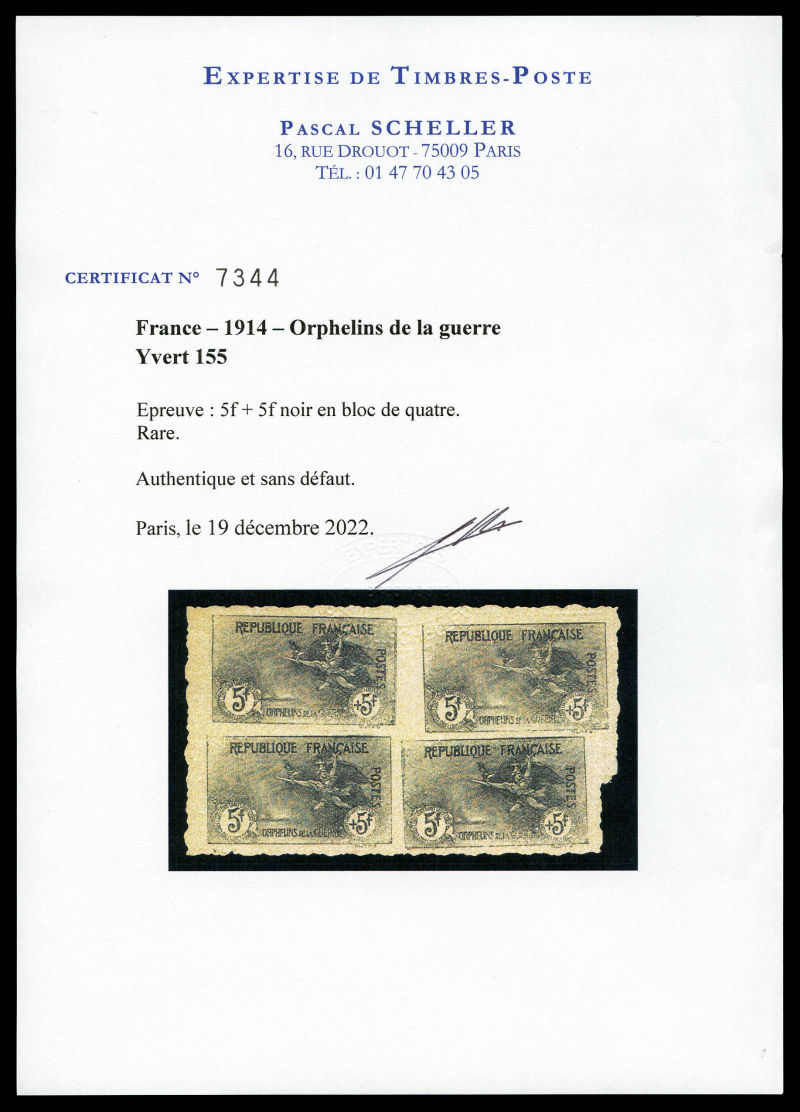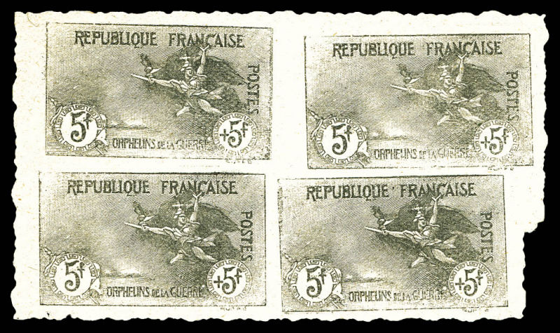Orphelins, 5F +5F: épreuve non dentelée en noir en bloc de quatre, SUPERBE et RARE (signé Calves/certificats) Qualité: (*) Cote: 16000 euros (Image) (image2)