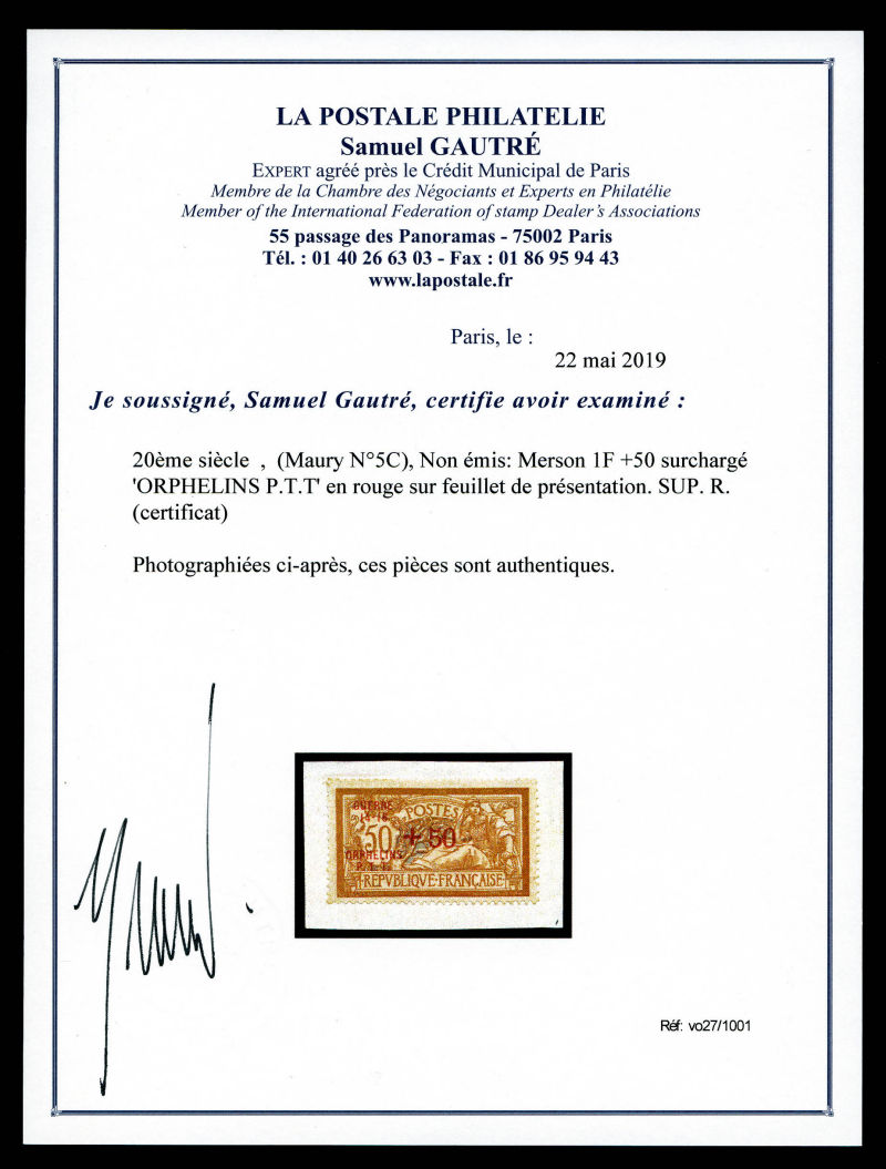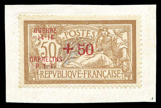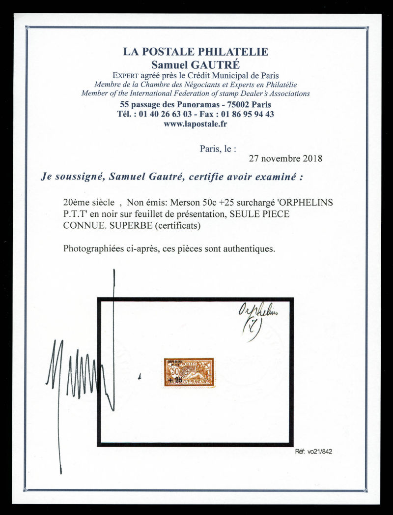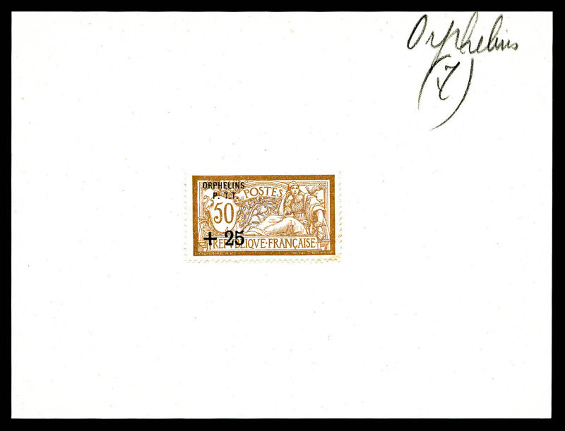 Non émis: Merson 50c +25 surchargé 'ORPHELINS P.T.T' en noir sur feuillet de présentation, SEULE PIECE CONNUE. SUPERBE (certificats) Qualité: (*) Cote: 13500 euros