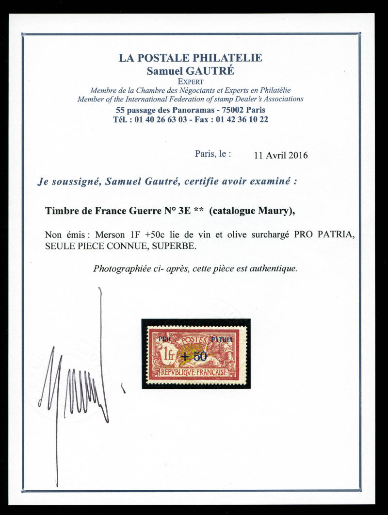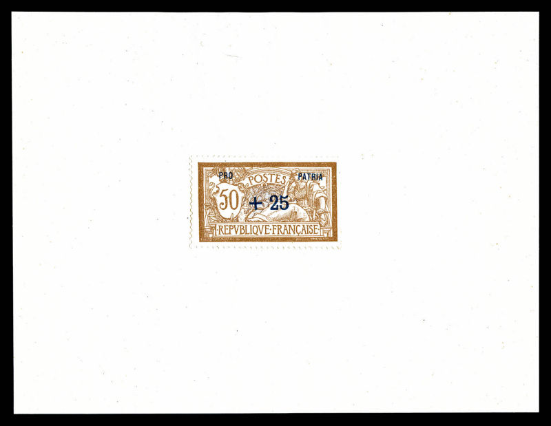 Merson 50c +25 surchargé 'PRO PATRIA' en bleu sur feuillet, SEULE PIECE CONNUE. SUPERBE (certificats) Qualité: (*) Cote: 13500 euros (Image)