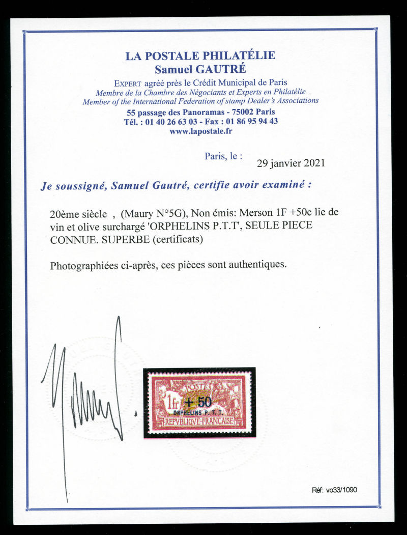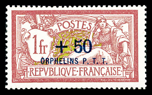 Non émis: Merson 1F +50c lie de vin et olive surchargé 'ORPHELINS P.T.T', SEULE PIECE CONNUE. SUPERBE (certificats) Qualité: ** Cote: 13500 euros (Image) (image2)