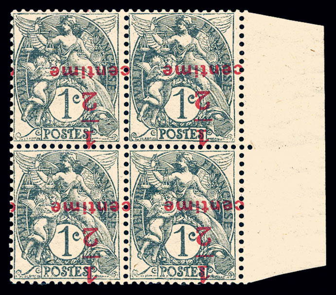 sur 1c ardoise papier GC: SURCHARGE RENVERSEE, bloc de quatre bdf. SUPERBE. R. (signé Calves/certificat) Qualité: ** Cote: 9600 euros (Image) (image2)