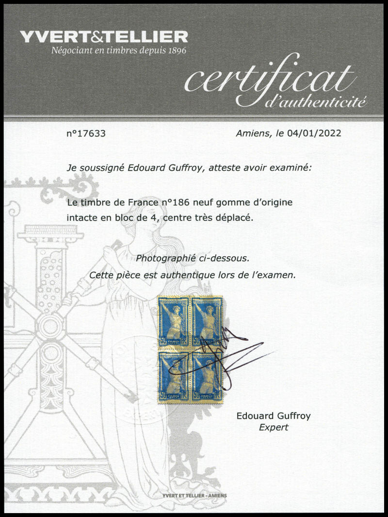 186a, les 2 variétés TB (certificat) Qualité: ** Cote: 750 euros (Image)