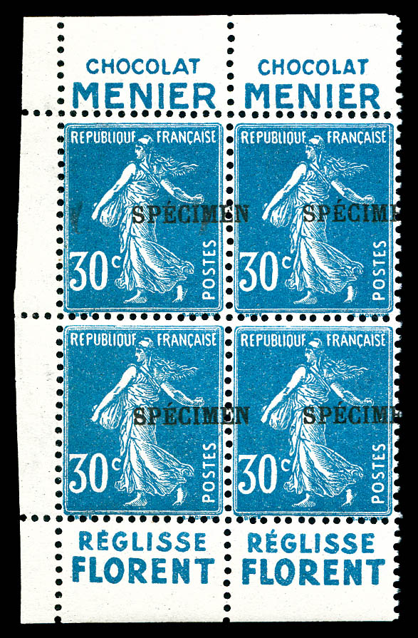 30c Semeuse, surcharge 'SPECIMEN' à cheval sur bloc de 4. SUP (signé Brun/certificat) Qualité: ** (Image)