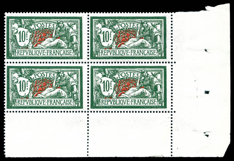 Merson, 10f vert et rouge en bloc de quatre coin de feuille. SUPERBE (certificat) Qualité: ** Cote: 1600 euros (Image)