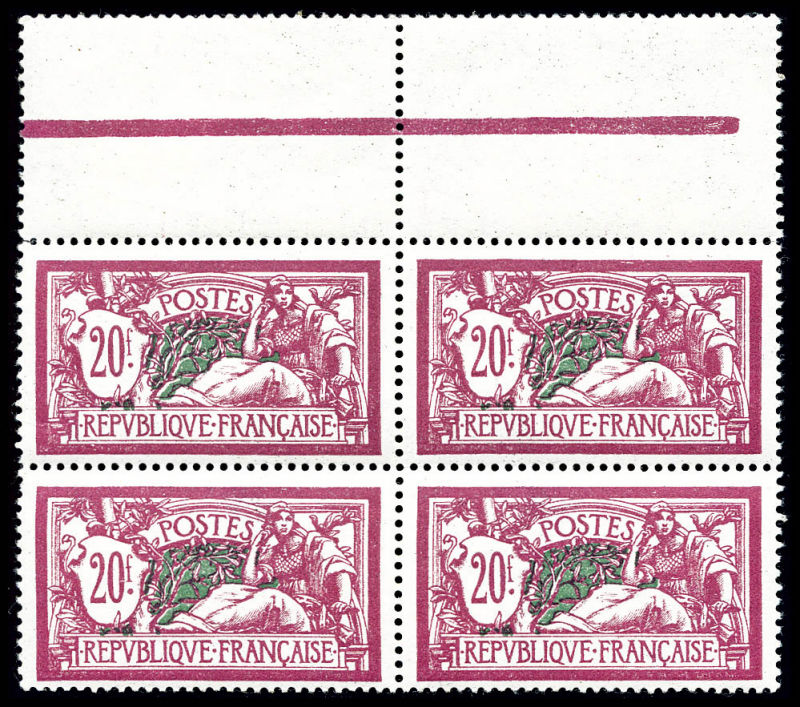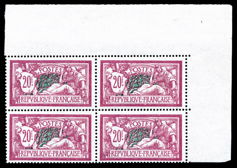 Merson, 20F lilas-rose foncé et vert-bleu en bloc de quatre haut de feuille, très bon centrage, SUP (certificat) Qualité: ** Cote: 3600 euros (Image)