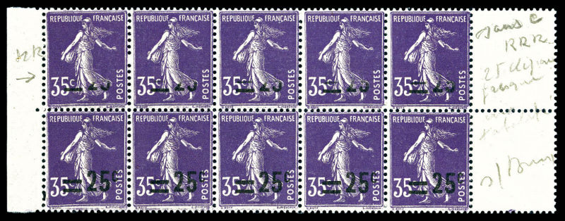 sur 35c violet: 5 exemplaires surcharge quasi absente tenant à normaux en bloc de 10 bdf. SUPERBE. R. (signé Brun/certificat) Qualité: ** Cote: 2000 euros (Image)