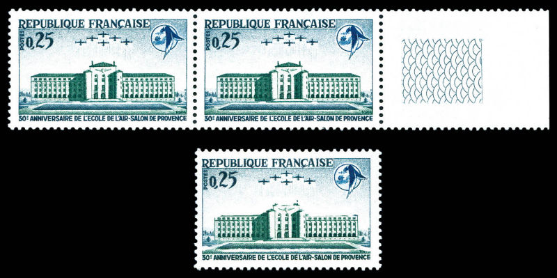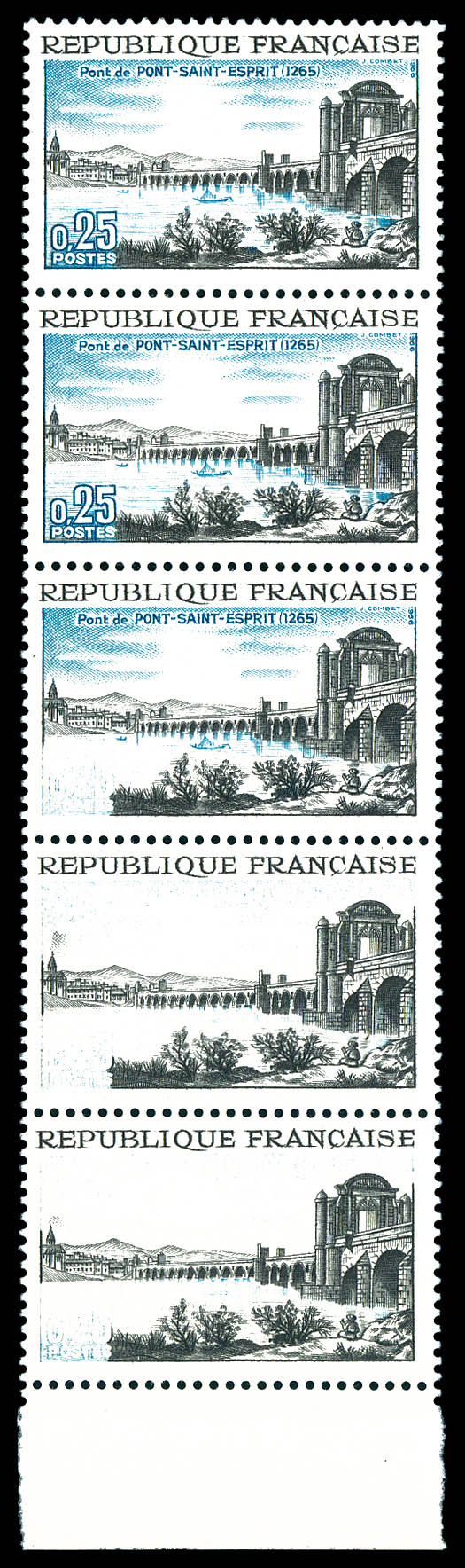 Pont St Esprit, couleur bleue asente sur 2 timbres tenant à couleur bleue partielle tenant à normaux dans une bande de 5 bdf. SUPERBE. R. (signé Calves/certificat) Qualité: **