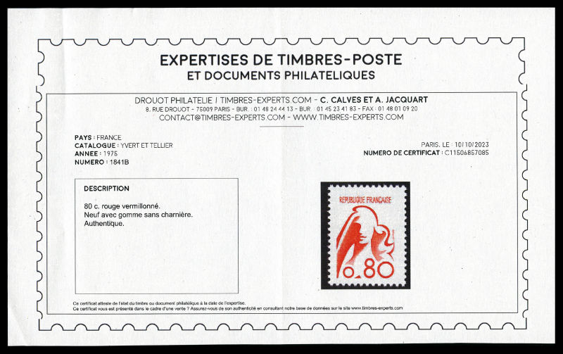 EMIS: Marianne de Durrens (1975), 80c rouge-orange bdf, R.R. et SUP (certificat) Qualité: ** Cote: 2250 euros (Image)