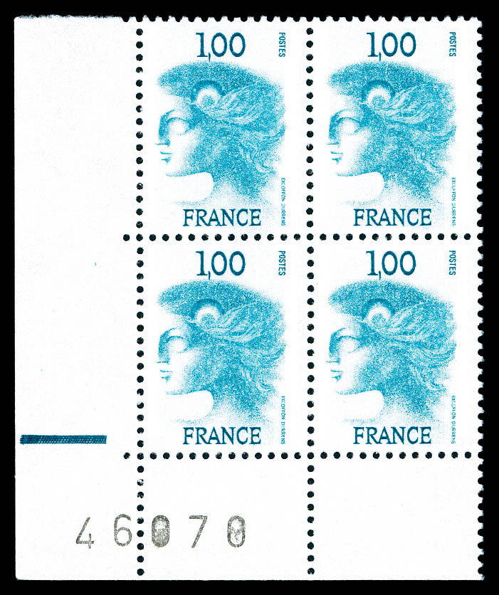 émis, 1F Turquoise, Marianne d'EXCOFFON, Non émis en bloc de quatre coin de feuille avec numéro '46978' et repère électronique. SEULE PIECE CONNUE. R.R.R. SUPERBE (certificat) Qualité: ** (Image)