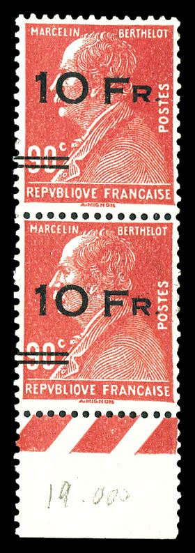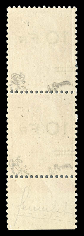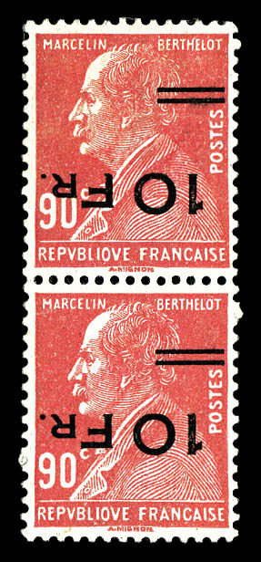 Berthelot 10F sur 90c rouge, PAIRE SURCHARGE ESPACEE TENANT A NON ESPACEE RENVERSEES (1ex*), très bon centrage, PROBABLEMENT LE PLUS BEL EXEMPLAIRE DES 5 PIECES CONNUES. Grande rareté de la philatélie francaise du XXème siecle. SUPERBE. (signé