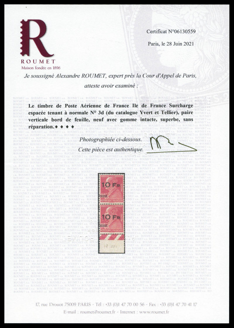 Berthelot, 10F sur 90c rouge, surcharge espacée tenant à normal bas de feuille, fraîcheur postale, qualité parfaite. SUP. R. (signé/certificats) Qualité: ** Cote: 13000 euros